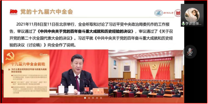 会议第一项,由研究生红色理论学讲团成员张佳琴同志为支部讲授《三个历史决议跨越百年——学习贯彻党的十九届六中全会精神》的微党课。本次微党课讲述了《关于若干历史问题的决议》《关于建国以来党的若干历史问题的决议》《中共中央关于党的百年奋斗重大成就和历史经验的决议》的主要内容及历史意义,号召党员同志“筑牢思想之基”“坚定理想信念”“统一行动作为”,时刻牢记“请党放心,强国有我”!