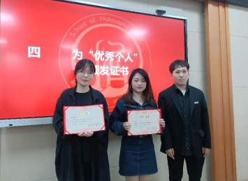 会议第四项,公司党建辅导员邓小磊为优秀个人宁淼、车思慧两位同学颁发荣誉证书。