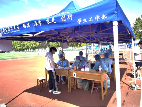 图:2022年4月9日,中心操场,教二支部宣传委员张炯博士后投入志愿工作
