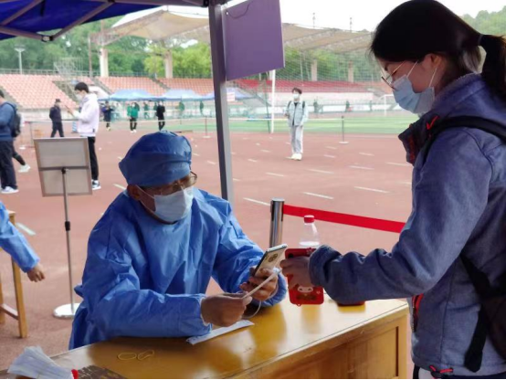 图:4月16日,公司党委副书记闫俊懂(上)和党办主任舒年春(下)作为当天的志愿者,完成师生信息登记以及分发检测棉签,协助组织全校师生有序完成核酸检测工作。