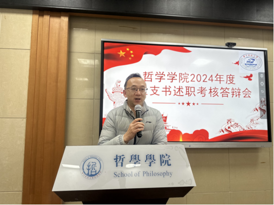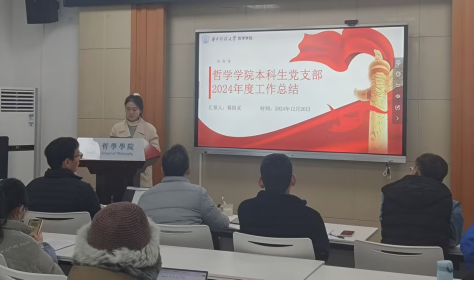 本科生党支部书记蔡阳灵从支部基本情况、一面旗帜、两翼驱动、三维发展、四型党员、五项展望六个方面介绍了党支部过去一年的工作。该支部切实做到谋划在前、干事当先、聚焦特色、创新工作,邀请学讲团、专家学者、退伍老员工讲授微党课,深入体悟党的二十大精神,增设“哲样学习”环节,开展4次“党史校史知识问答”,增加实践学习环节形式。多样化的党建活动不断发挥党员先锋模范作用,发挥党建引领团建和班级建设。