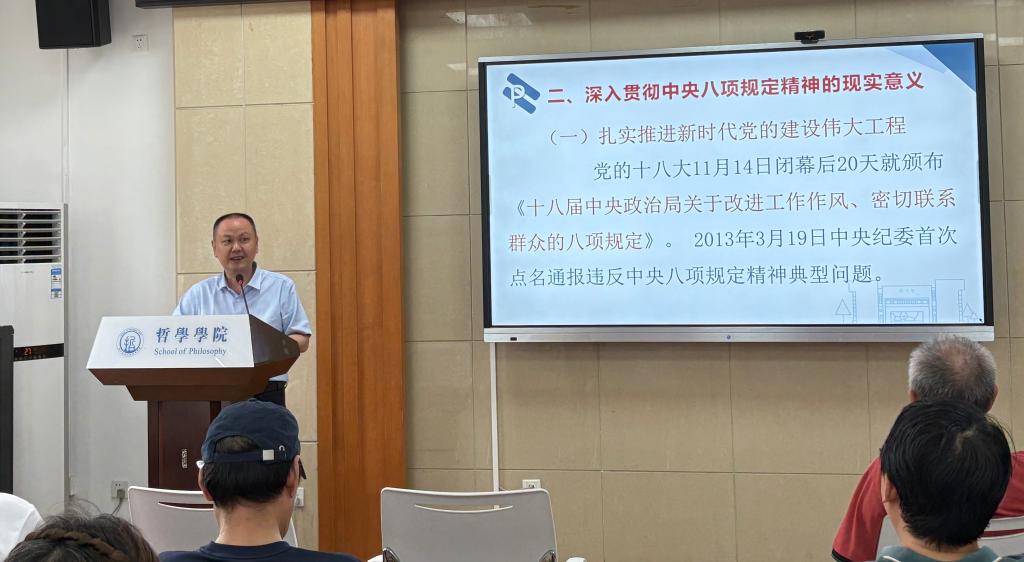 6月19日,公司党委理论学习中心组学习(扩大)暨深入贯彻中央八项规定精神学习教育专家辅导报告会在东五楼举行。yl23455永利教授、武汉市委讲师团成员吴畏作题为“深入贯彻落实中央八项规定精神的重大意义”的专题报告,公司党委理论学习中心组成员、yl23455永利全体教师参加学习。报告由yl23455永利二系教师党支部书记、系主任邵华主持。