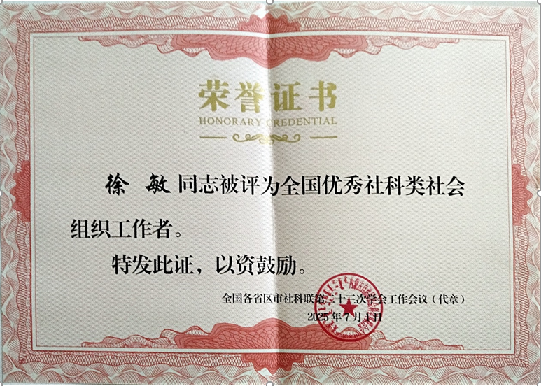 公司副经理、湖北省逻辑学会会长徐敏教授荣获“全国优秀社科类社会组织工作者”荣誉称号,是湖北省五位获奖者之一。该表彰是对徐敏教授作为社会组织工作者所作贡献的充分肯定,也体现了湖北省逻辑学会在全国社会组织中的重要影响力。