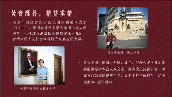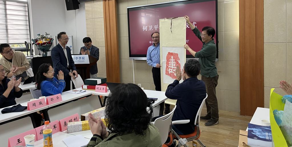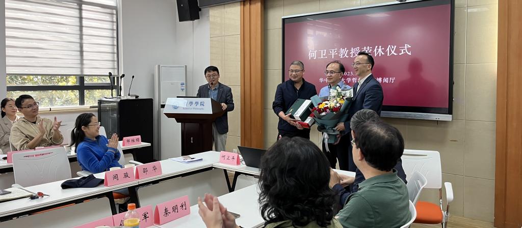 第四项,荣休演讲。何卫平教授发表了“我的解释学之路”专题演讲。以个人求学、治学的经历为切入点,回首过往,讲述了自身如何在家庭的影响下形成自律、刻苦求学的习惯;如何在杨祖陶先生、陈修斋先生、张志扬教授、邓晓芒教授、刘纲纪教授等人的影响下关注、了解解释学并将其作为研究主要方向的过程。他认为在近四十载的求学和教学历程中继承前人的学术成果并努力走出属于自己的解释学之路,能够将工作与爱好融合一体是非常幸福的。