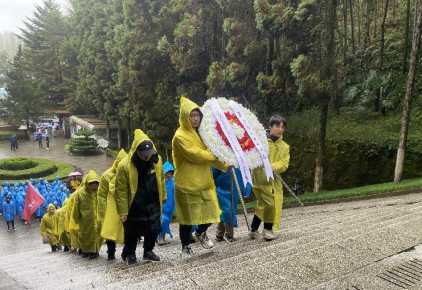 11月12日上午九点,我们来到了红色研学第二站——井冈山革命烈士陵园。伴着如丝细雨,全体师生在讲解员的引领下,一路聆听革命先烈英勇事迹,重温那段艰苦伟大的井冈山斗争岁月。两年零四个月的井冈山斗争,共有四万八千名革命烈士壮烈牺牲,陵园吊唁大厅内数块巨大的黑色石碑环屋而立,镌刻着15744位革命烈士的英名,大厅正中竖立着一块圣洁的无名碑,纪念着三万多名无名英雄。怀着对革命先烈们的崇高敬意,全体师生拾级而上,缓步走向纪念堂吊唁大厅,共同向浴血井冈、长眠青山的先烈们敬献花篮,缅怀革命先烈英勇斗争、无畏牺牲的革命精神。随后,面对鲜红的党旗,师生党员于纪念堂外重温入党誓词,以铿锵有力的誓言,许下不忘初心的承诺,担起不负时代的重任。