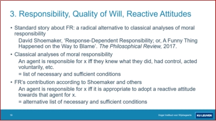 在讲座开始,DeMesel指出在当代道德哲学讨论中有两个非常重要的问题:(a)自由意志和决定论的“相容性问题”;(b)道德责任问题。相容性问题指的是,在决定论成立的前提下人们是否可以拥有自由意志?而道德责任问题指的是,在什么条件下一个行动者需要为自己的行为承担道德责任?对于这两个问题,经典的相容论者(classical compatibilist)通常持有以下观点: