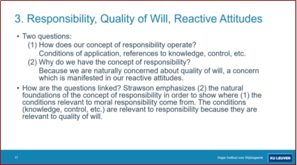 维特根斯坦对斯特劳森的影响主要体现在斯特劳森关于方法论的著作上。在这些方法论著作中,斯特劳森区分了哲学家的两项重要任务:(a)解释我们拥有的概念是如何运作(operate)的;(b)解释我们为什么会拥有这些概念。如果我们把这两项任务与“道德责任”这一概念联系在一起,那么我们就可以把道德责任问题区分为以下两个问题: