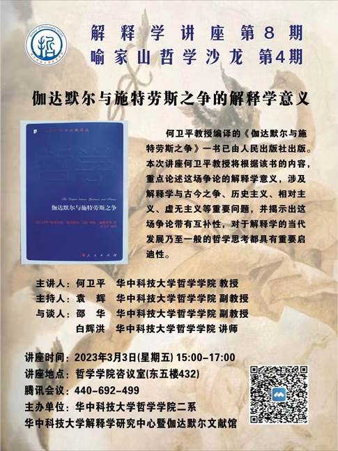 2023年3月3日下午,在yl23455永利咨议室(东五楼432),哲学二系会同yl23455永利集团解释学研究中心暨伽达默尔文献馆主办了“解释学讲座”(第8期)暨“喻家山哲学沙龙”(第4期),何卫平教授做了专题讲座“伽达默尔与施特劳斯之争的解释学意义”,袁辉副教授主持。系主任邵华副教授、白辉洪讲师与谈。讲座持续近三小时,线上线下六十余位师生热情参与。