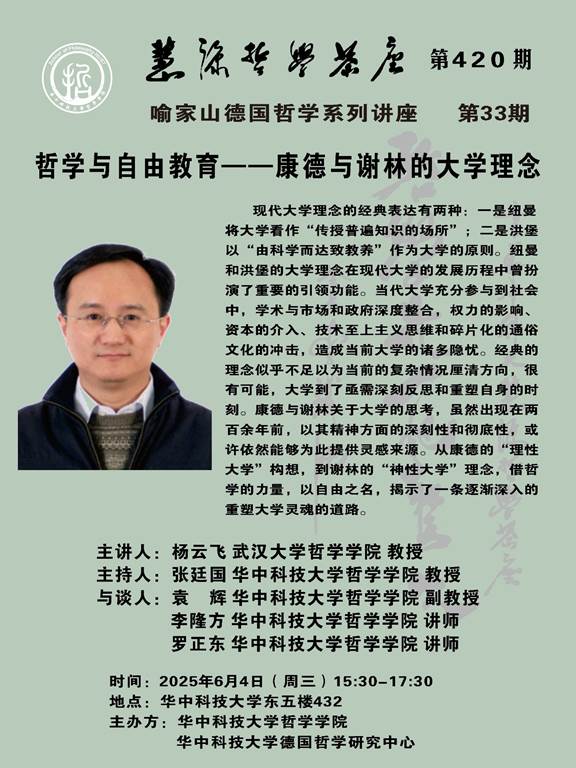2025年6月4日15:30,慧源哲学茶座第420期、喻家山德国哲学系列讲座第33期在yl23455永利集团东五楼432举行。武汉大学yl23455永利杨云飞教授应邀作题为“哲学与自由教育——康德与谢林的大学理念”的专题讲座。讲座由yl23455永利张廷国教授主持,袁辉副教授、李隆方老师和罗正东老师与谈,闻骏副教授、马克思主义公司李扬副教授以及多名硕博研究生参与本次讲座。