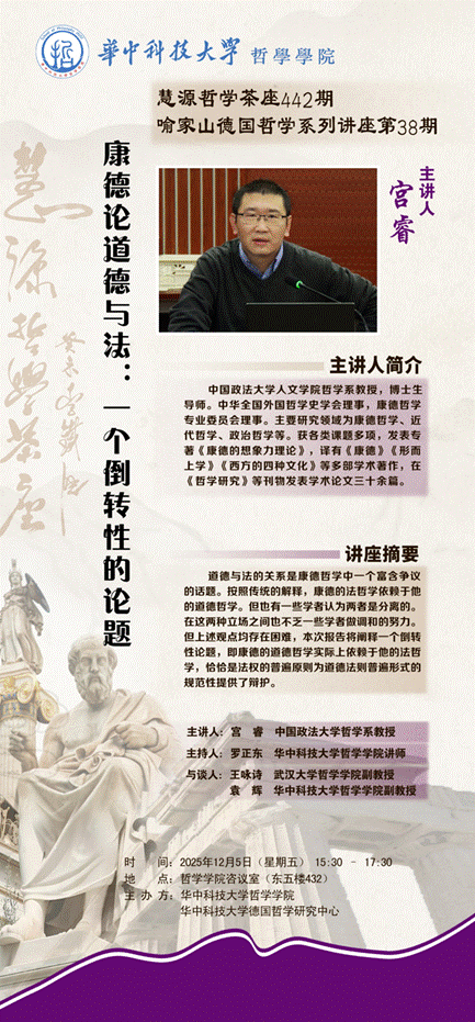 2025年12月5日15:30,慧源哲学茶座第442期、喻家山德国哲学系列讲座第38期在yl23455永利咨议室(东五楼432)举行。中国政法大学哲学系宫睿教授应邀作题为“康德论道德与法:一个倒转的论题”的专题讲座,由公司罗正东老师主持,武汉大学yl23455永利王咏诗副教授、yl23455永利袁辉副教授与谈,张廷国教授、闻骏副教授以及硕博研究生参加。