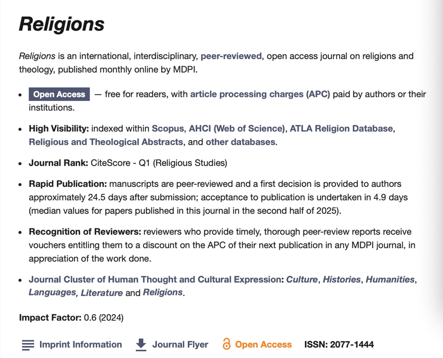 据悉,Religions属于A&HCI期刊,影响因子0.6,SCIMAGO期刊排名(SJR)1区(Q1,Religious Studies)。
