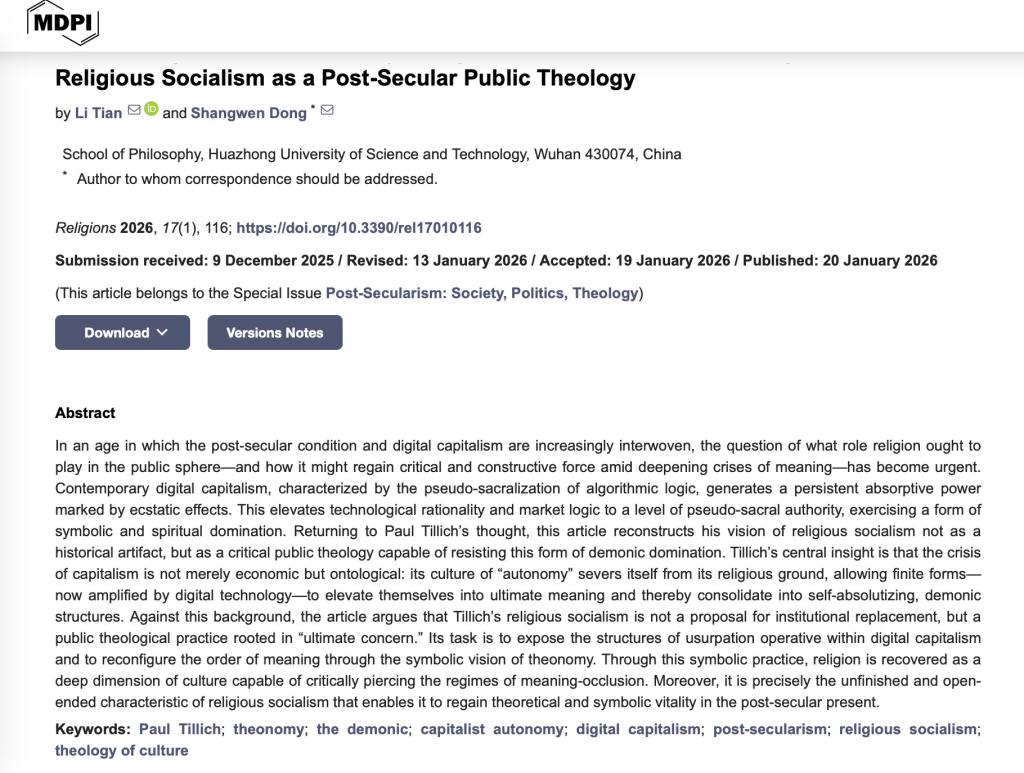 Li Tian and Shangwen Dong. 2026.“Confronting Demonic Autonomy in Digital Capitalism: Reconstructing Tillich’s Religious Socialism as a Post-Secular Public Theology”. Religions 2026, Volume 17, Issue 1, 116;