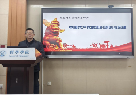 培训班第四讲由闫俊懂老师讲授《中国共产党的组织原则和纪律》。针对中国共产党的组织原则,他介绍民主集中制的知识和内涵。他从实际案例出发,和同学们一起学习了中国共产党的六大纪律,学习了庄严的“入党誓词”,强调了入党的严肃性,强调要严格遵守党员廉洁自律规范,做一名合格党员。
