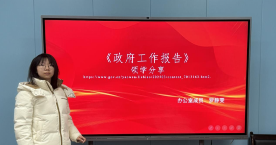 罗静雯领学分享《政府工作报告》。她强调,《政府工作报告》从2024年工作回顾、2025年经济社会发展总体要求和政策取向和2025年政府工作任务三方面展开。今年是“十四五”规划收官之年。高质量完成“十四五”规划目标任务,为实现“十五五”良好开局打牢基础。报告强调以人民为中心的发展思想,统筹发展与安全,推动经济实现质的有效提升和量的合理增长,为全面建设社会主义现代化国家开创新局面。