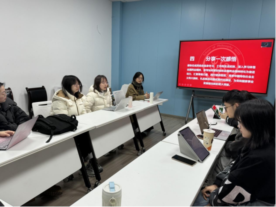 在场成员分为两组进行讨论后,分别派出一人总结发言。尹明华总结发言时指出,两会精神与人民生活息息相关,并不是宽泛的概念。我们需要多看多听多写,才能理解真正的两会精神,比如国补政策、银发经济等。我们可以通过志愿活动等把个人生活融合到国家发展中。程光瑜总结发言时用“春天”描述目前我国的发展状况,而亮眼成绩的背后,是科技创新、新兴产业和市场活力等关键要素的有力支撑。值得一提的是,绿色消费和产业融合发展等理念也在经济发展中得到了充分践行。作为哲学专业的员工,我们可以发挥哲学学子担当,分析会议精神,研究科技伦理,助力科技稳扎稳打发展。