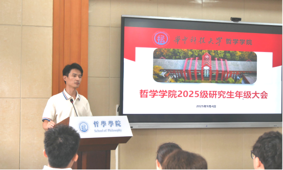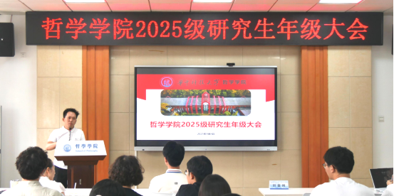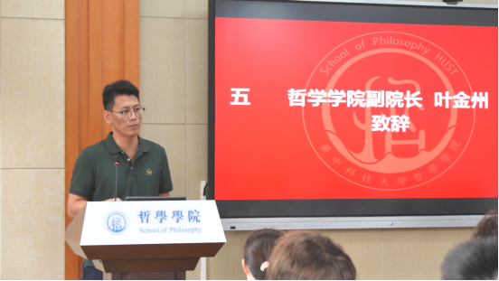 会议第一项,副经理叶金州致辞。他围绕研究生阶段的学习与发展,从明确研究生教育定位、强化主动探索意识、树立危机与责任观念、恪守学术规范准则四个方面对新生提出具体要求和殷切期望。他指出,哲学研究的突破往往始于主动提问与持续追问,新生应尽早与导师建立深度沟通,从文献梳理到问题凝练主动规划,将学术兴趣转化为持久研究动力,为学术成果的孕育奠定基础。同时他还强调,对于哲学研究而言,每一个论证环节的真实性、每一处引文的准确性,都是思想有效性的基石,任何形式的学术不端都将消解哲学思考的价值,新生必须以敬畏之心守护学术纯洁性。