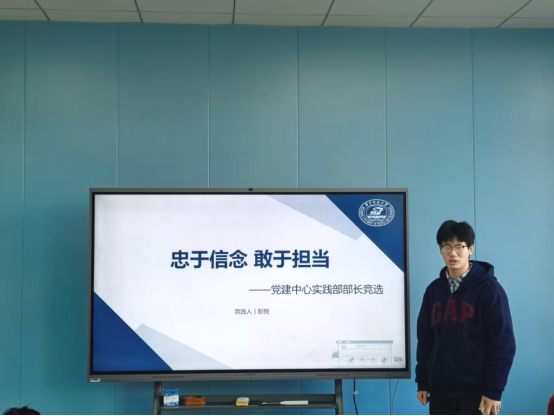 彭悦同学进行实践部负责人竞选答辩。他以“忠于信念,敢于担当”为主题从职位认知、工作经历、自我展望等方面展开答辩。他重点展示了作为班长、助理班主任和乡镇兼职团干的工作情况,同时通过三下乡、暑期支教等志愿活动成果体现实践能力与经验。