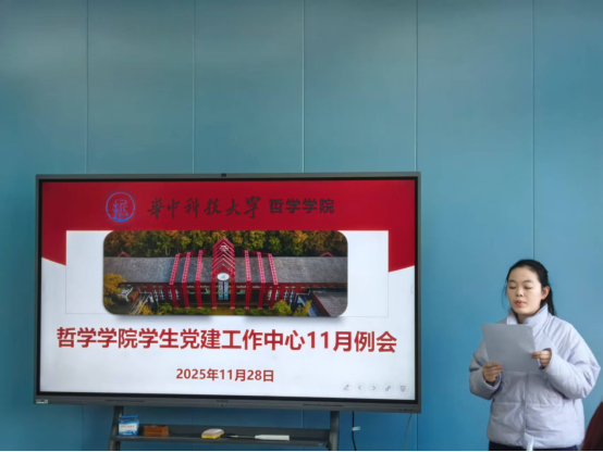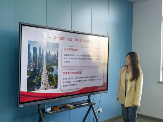会议第七项,由赵怡同志讲授微党课。这堂微党课以《学习贯彻党的二十届四中全会精神——<中共中央关于制定国民经济和社会发展第十五个五年规划的建议> 专题学习》为主题,深刻阐释了“十五五”规划建议的核心要义与战略部署。赵怡同志结合哲学学科思维,深入浅出地分析了规划建议中蕴含的新发展理念、高质量发展要求以及对中国式现代化道路的深远布局。她强调,作为新时代的哲学学子,要深刻理解国家发展蓝图背后的理论逻辑与实践指向,自觉将个人成长融入民族复兴伟业,用哲学智慧观照现实、指导实践。微党课不仅深化了与会成员对党和国家大政方针的理解,也激发了大家运用专业所学服务国家战略的使命感和责任感,现场反响热烈。