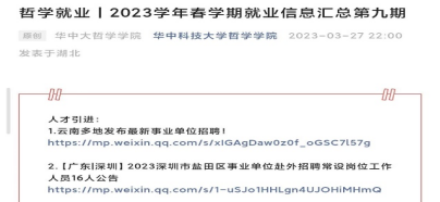 职业发展部部门成员定期收集就业招聘信息,加以筛选并定期发布在“yl23455永利”公众号,三月已发布“哲学就业|2023学年春学期就业信息汇总”第八期与第九期。