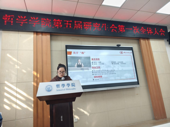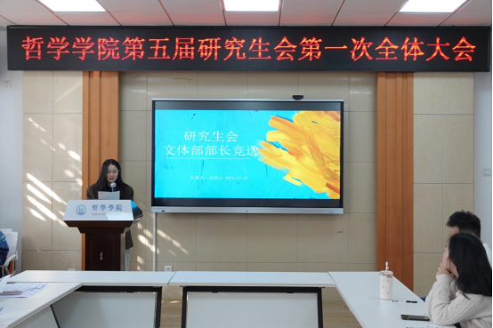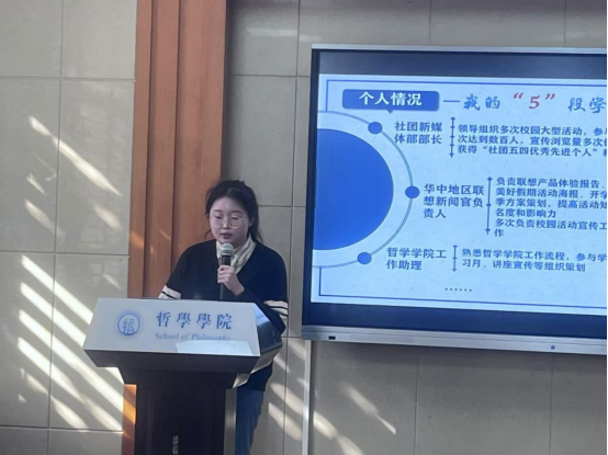 文体部成员史译云着重展示了丰富的工作经历。她在本科期间开展了多项工作,涉及到微电影的电影脚本制作以及街采策划和新人培训,学习到了许多电影理论知识以及活动的统筹规划。在加入院研究生会后,组织参与了校运动会等多项活动。