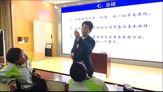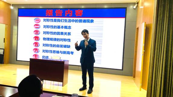 傅华华教授以《对称性与对称中的不对称——另一个视角看自然现象和物理规律》开展科普报告,傅教授从对称性是我们生活中的普遍现象、对称性的基本概念、对称性与因果关系、物理规律的对称性、对称性的自发残缺、对称性思维与新高考六个方面进行讲解,并通过一枚普通的螺丝钉进行了现场试验,最后强调了对称性是新高考的重点内容,同学们饶有兴趣。