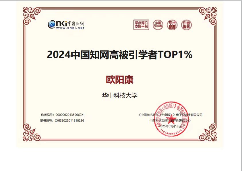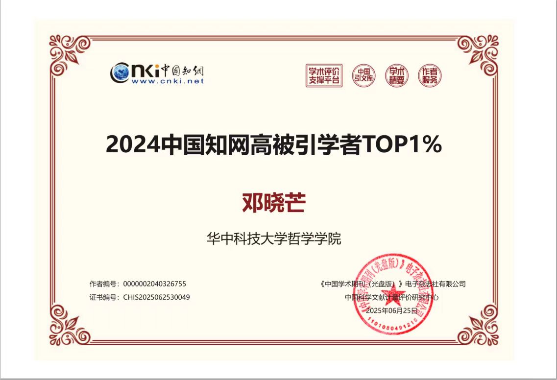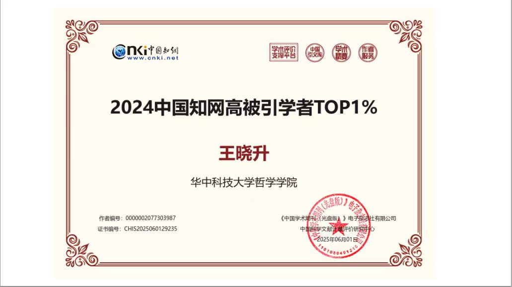 公司邓晓芒、欧阳康、韩东屏、何卫平、王晓升五位教授入选“2024中国知网高被引学者TOP1%”群体。