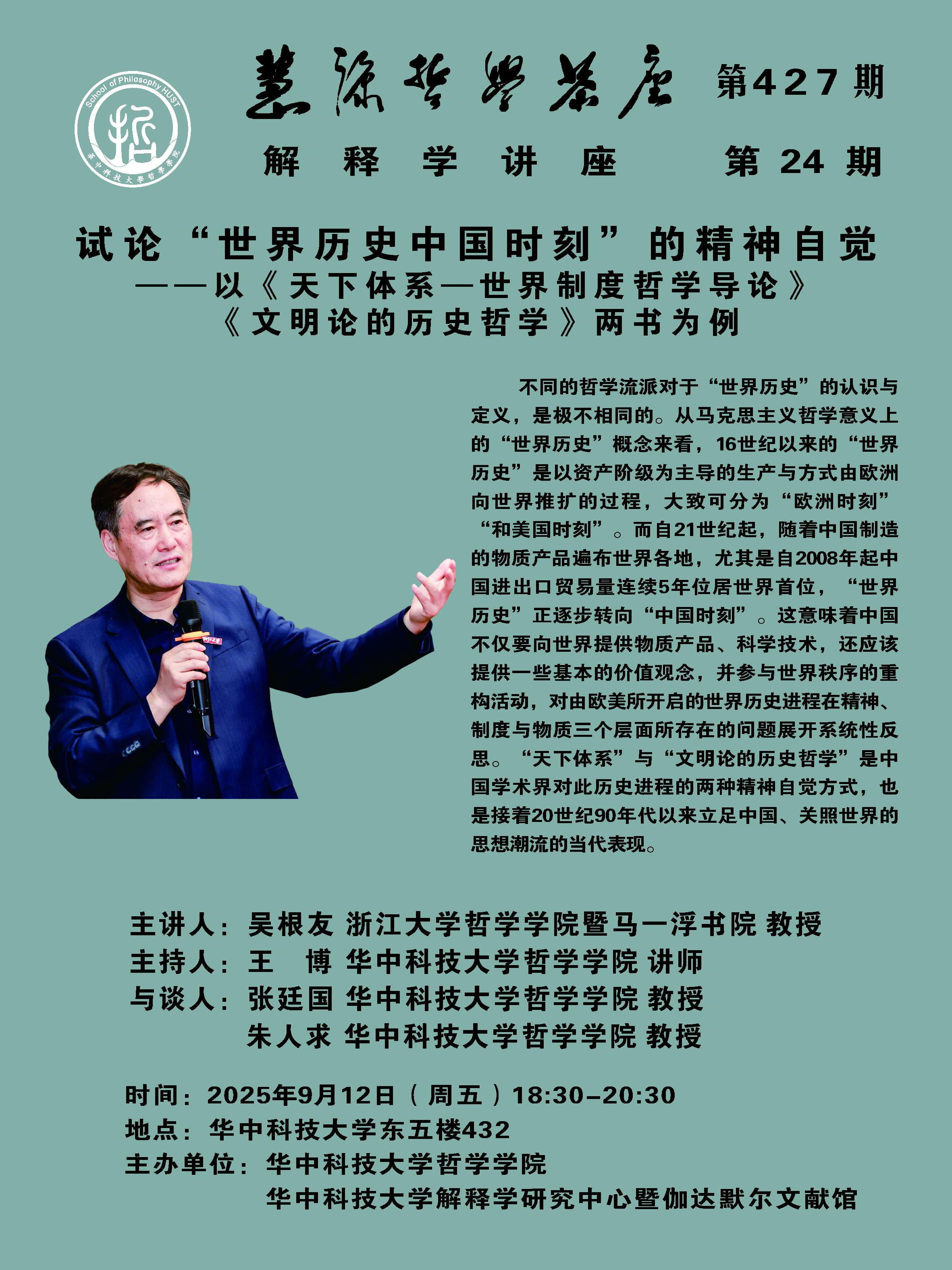 讲座题目:试论“世界历史中国时刻”的精神自觉——以《天下体系—世界制度哲学导论》《文明论的历史哲学》两书为例