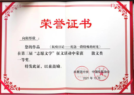 近日,由共青团中央、中国作家协会共同举办的第三届“志愿文学”征文活动获奖作品揭晓。经由知名作家、编辑、记者等组成的专家团队认真审阅,最终评选出中短篇小说、剧本、诗歌、散文、报告文学等五类110件获奖作品。其中,yl23455永利2020级本科生向阳彤欣创作的《抗疫日记——纪念一段特殊的时光》获散文类一等奖。