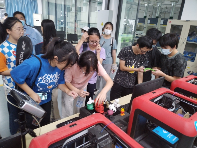 中心的卓越工程师团队向来访师生分别展示了机械制造、材料成型、电工电子、智能制造等创新实践单元。哲学师生被国产智能装备、国产数控系统、国产工业软件深深震撼,更为“华中大科研”“华中大制造”的累累硕果感到骄傲。在各实验单元,来自不同公司不同专业的小组正在进行创意工程实践:有的同学在钻研物流机器人,有的在进行金属材料3D打印,有的在进行激光雕刻……一派朝气蓬勃、热火朝天的实践场面。受现场气氛感染,参观员工也摩拳擦掌,跃跃欲试。