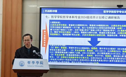 副经理徐敏领学了教育部和公司有关文件精神,解读了本轮本科公司产品审核评估的主要变化和指标体系;从专业定位、改革举措、改革成效、特色优势、研讨改进、强基计划实验班办学成效总结报告和哲学本科专业2024级培养计划修订调研报告七个方面进行汇报;总结了近三年本科公司产品成绩,梳理了需要进一步研讨的问题,提出了解决思路与具体举措。