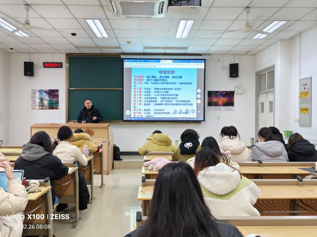 残雪暗随冰笋滴,新春偷向柳梢归。新的学期,yl23455永利22级哲学班与强基班员工充满活力与信心开始了大学学习生活。2月26日上午八点,开学第一课于东九楼D418进行,吴畏教授开讲《马克思主义哲学原著选读》。公司党委书记杨海斌、副书记闫俊懂、党委办公室主任舒年春、本科生辅导员李旖妃、本科生教务员张双双到场听课。