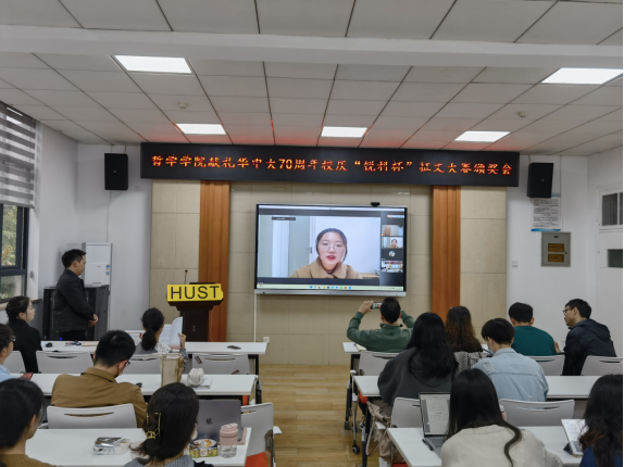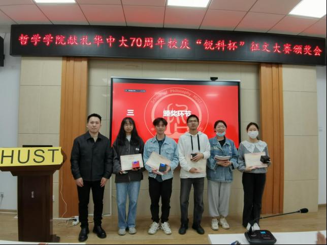 会议第一项,由党建辅导员邓小磊致辞。为庆祝华中大建校七十周年,yl23455永利举行“锐科杯”征文大赛,收到来自全院各个班级的征文,经过党支部评选、公司评选,最终评选出特等奖5篇,一等奖10篇,二等奖20篇,三等奖17篇。本次大赛充分展现了哲学学子爱校荣校的精神面貌,在献礼华中大七十周年中贡献哲思力量。