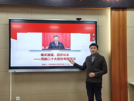 第十组哲思飞扬队带来的微党课主题是《雄关漫道,迈步从头——党的二十大报告专题学习》。小组代表丁一达首先详细解读了党的二十大报告主题,其次展示了百年来党取得的伟大成就以及宏伟蓝图;最后对中国式现代化这一新概念进行了细致地讲解。